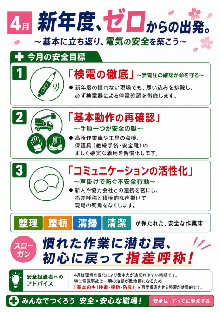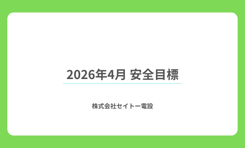 当社では、毎月安全目標を掲げております。安全で安心な職場環境は、現場スタッフにとって大切なだけでなく、お客様や他業者に対するサービスの向上にもつながります。そのため、経営スタッフや現場スタッフの全員が積極的に安全活動に取り組むことが重要と考えております。