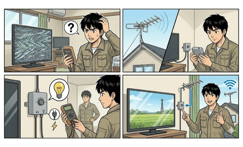 ブースターは「弱い電波を増幅する装置」ですが、増幅できるのはあくまでアンテナが受信できた電波だけです。さらに、増幅しすぎると今度は「過入力」という別のトラブルが発生します。ブースターは「つければいい」ではなく、「必要かどうかの判断」「適切な増幅量の選定」「正しい設置場所の決定」という3つの判断がすべて正しくて初めて効果を発揮する機器です。