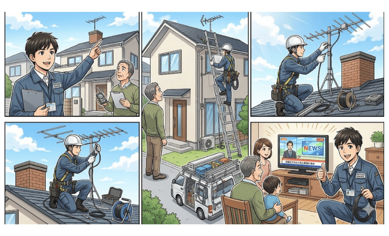 アンテナ工事の流れを知ることは、「何をされているかわからない不安」を解消するだけでなく、業者の仕事の質を判断する目を育てることにもつながります。電波測定をしているか・防水処理を丁寧に行っているか・受信レベルを数値で確認してから終了しているか——これらを知っているだけで、信頼できる業者かどうかの見極めが格段にしやすくなります。