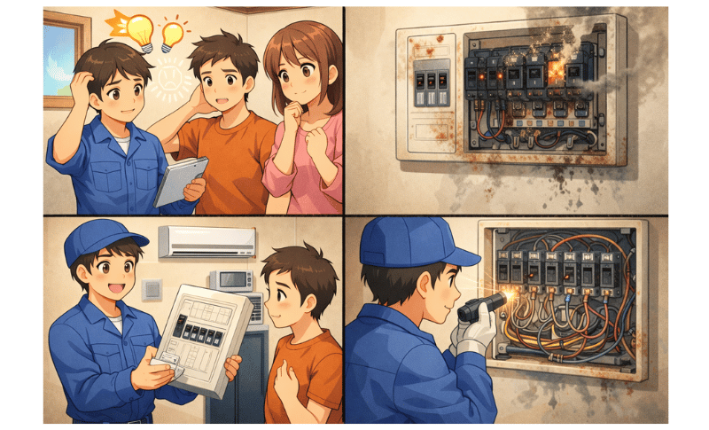 3つ目は「電気の使い方の変化」です。エアコンを増やした、IHクッキングヒーターに変えた、電気自動車の充電器を設置したなど、家全体で使う電気の量が増えたときは、古い分電盤では容量不足になることが多いです。断定はしませんが、「ライフスタイルが変わるときは、電気の入り口も見直す良い機会」と私たちは考えています。