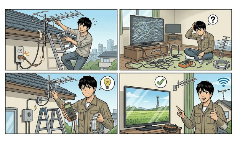 しかし現場の電気工事士として、DIYアンテナ設置には見過ごせないリスクが複数あることを、正直にお伝えしなければなりません。高所での転落リスク・固定不良による台風・積雪時の倒壊リスク・接続ミスによる受信不良・同軸ケーブルの不適切な処理による劣化——これらは「やってみたらできた」という達成感の陰に潜む、時間差で表面化する落とし穴です。