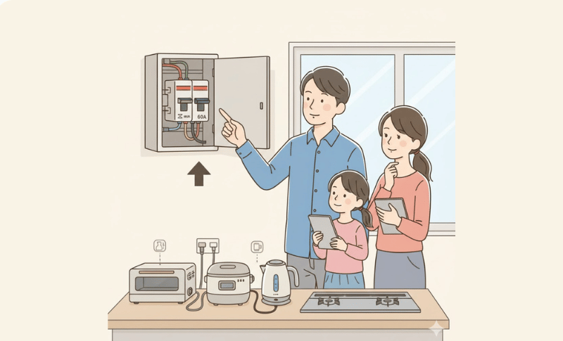 電気容量は、数字を覚えることが目的ではありません。「同時に使うとどうなるか」を知り、困らない暮らしや仕事を作るための考え方です。ブレーカーが落ちるのは危険を避けるための動きなので、責めるべきではなく、見直しの合図として受け取るのが安心です。今の使い方に合っているかを一度確認するだけでも、突然の停電の不安は減らせます。事前に知っておくことが、いちばんの予防になります。