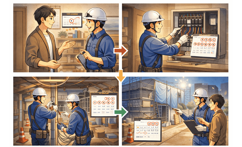 3つ目は「数日間〜」にわたる工事です。築古物件の全配線引き直しや、大規模なリフォーム、新築工事などがこれにあたります。現場の状況に合わせて、大工さんなど他の職種の方と連携しながら進めていくため、段階的に工事が行われます。