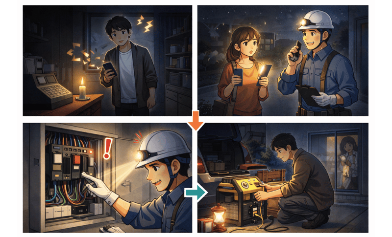 「電力会社に電話すべき?」「電気屋さんに頼むべき?」という窓口の判断も、停電の原因が分からない状態では迷うのが当然です。情報が断片的になりやすい状況だからこそ、整理された判断軸を持つことが大切になります。