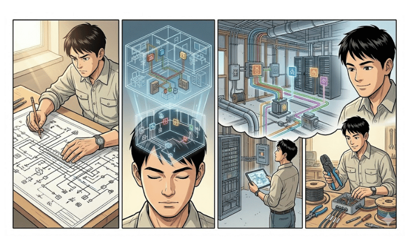 3つ目は「図面の『なぜ』を考えること」です。図面に描かれた配置や回路の構成には、設計者の意図が必ずあります。「なぜここにスイッチが2つあるのか」「なぜこの回路だけ別系統になっているのか」——こうした疑問を持ちながら図面を読む習慣が、設計の意図を正確に汲み取り、完成後に「使いやすい電気設備」を作ることにつながります。図面を「指示書」としてではなく、「設計者との対話」として読む姿勢が、一流の職人への近道です。