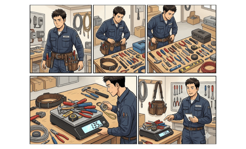 電気工事士が現場に向かうとき、腰まわりにはずっしりとした「腰道具」が巻かれています。ベルトにぶら下がった工具袋、ホルスター、各種工具——一式を装着すると、まるで戦士の装備のような存在感があります。「あれ、全部で何キロあるんだろう?」と気になったことはありませんか。