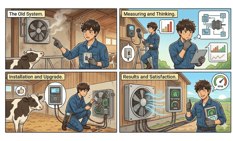 省エネと牛の健康管理が同時に改善されたこの現場は、インバーター制御の導入効果を最もわかりやすく示してくれた経験の一つです。