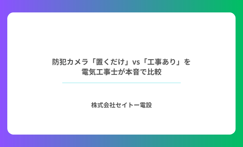 防犯カメラ選びは「手軽さ」ではなく「目的から逆算して必要な性能を決める」という順番で考えることが、後悔しない選択につながります。株式会社セイトー電設は、設置目的と環境に合わせた最適なカメラシステムの選定から設置工事・アフターフォローまで、一貫して対応します。