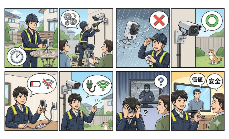 置くだけカメラが「まったく意味がない」とは言いません。室内のペット見守り・一時的な監視・費用を最小限に抑えたい場合など、用途によっては十分に機能します。しかし「本格的な防犯」「証拠映像の確実な記録」「長期間の安定稼働」を目的とするなら、工事ありのシステムが圧倒的に優れています。