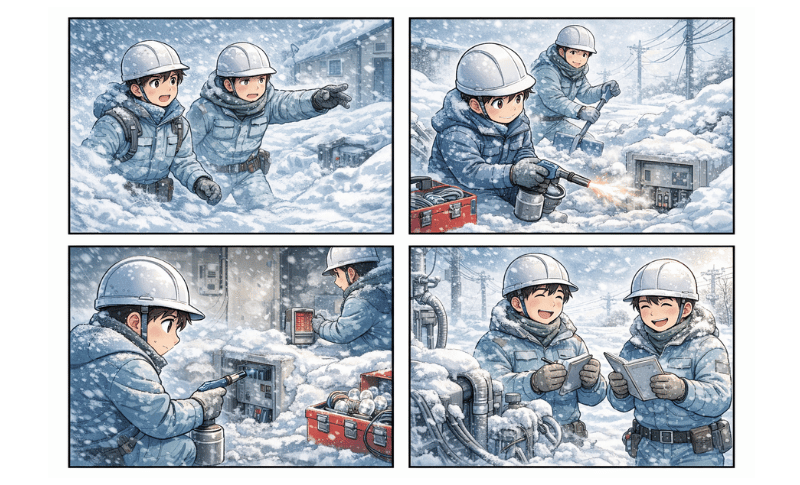 「吹雪の中で作業ができるのか」「寒さで機械が壊れないか」といった悩みは、お客様だけでなく、現場の若手工事士や管理担当者も同じように感じている切実な問題です。