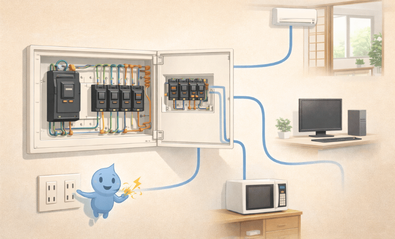 分電盤の中には、主に「主幹ブレーカー」と「分岐ブレーカー」が入っています。主幹ブレーカーは建物全体を守る大元で、ここが落ちると家やフロア全体の電気が止まります。分岐ブレーカーは、キッチン・洗面所・エアコンなど、場所や用途ごとに分けた回路を守るものです。たとえば電子レンジと電気ケトルを同時に使って一部だけブレーカーが落ちた場合、分岐ブレーカーが働いている可能性が高いです。分電盤が回路を分けているからこそ、全部が止まらずに済み、原因の切り分けもしやすくなります。