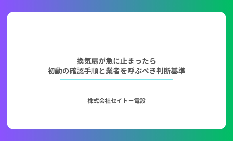 「換気扇が止まっているが原因がわからない」「ブレーカーが繰り返し落ちる」「モーターから異臭がする」——こうした症状が出ている場合は、すぐに株式会社セイトー電設にご連絡ください。現地に伺って状況を確認し、原因の特定から修理・交換・再発防止策まで、一貫して対応します。