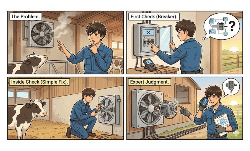 「なんとか自分で直そう」という判断が、感電事故・設備の二次破損・火災リスクにつながることがあります。判断に迷ったときは触らずに連絡する——これが、換気扇トラブル対応の最も安全な原則です。特に牛舎のような農業施設では、電気設備の不具合が経営に直結するため、早期の専門家対応が最善の選択です。