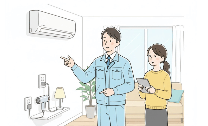 エアコンは家電の中でも電気を多く使う機器です。ただ、一般の方には配線や分電盤の中は見えないため、「コンセントに挿せば動くなら同じ」と思われがちです。現場の電気工事士は、動くかどうかよりも「安全に使い続けられるか」を優先して見ています。専用回路が必要かどうかは、エアコンそのものの性能だけで決まるのではなく、建物側の電気の流れや余裕を含めて判断するのがプロの視点です。