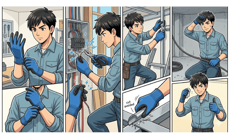 電気工事の現場では、作業の内容に応じて手袋を使い分けるのが基本です。特に重要な3つの場面をご紹介します。