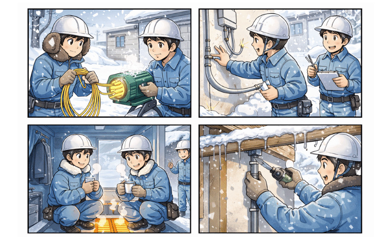 - 資材の温度を保つ: カチカチに凍った電線をそのまま使いません。車の中で温めたり、直前まで室内で保管したりして、被覆に傷がつかないよう柔らかい状態で施工します。